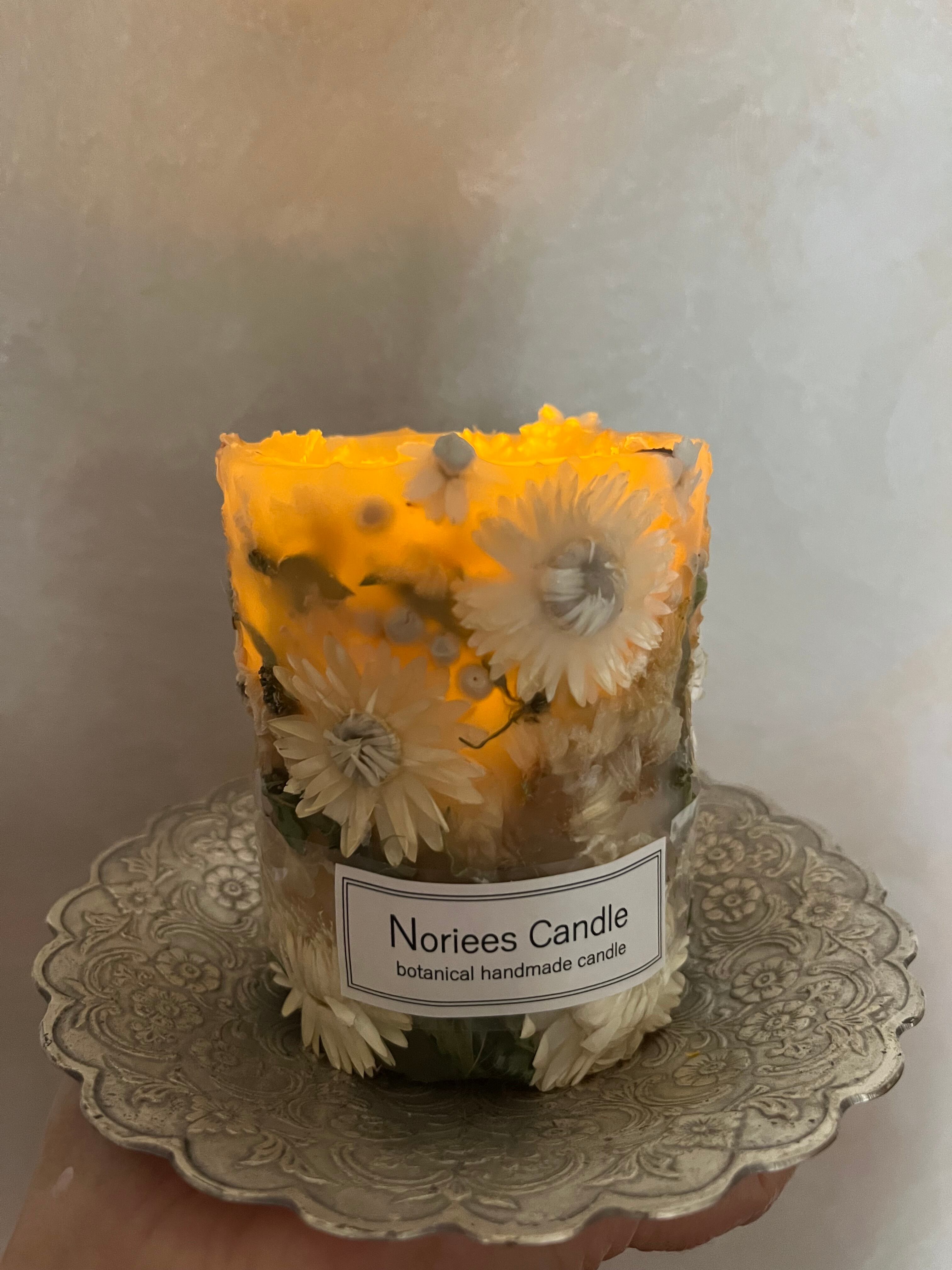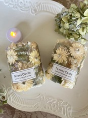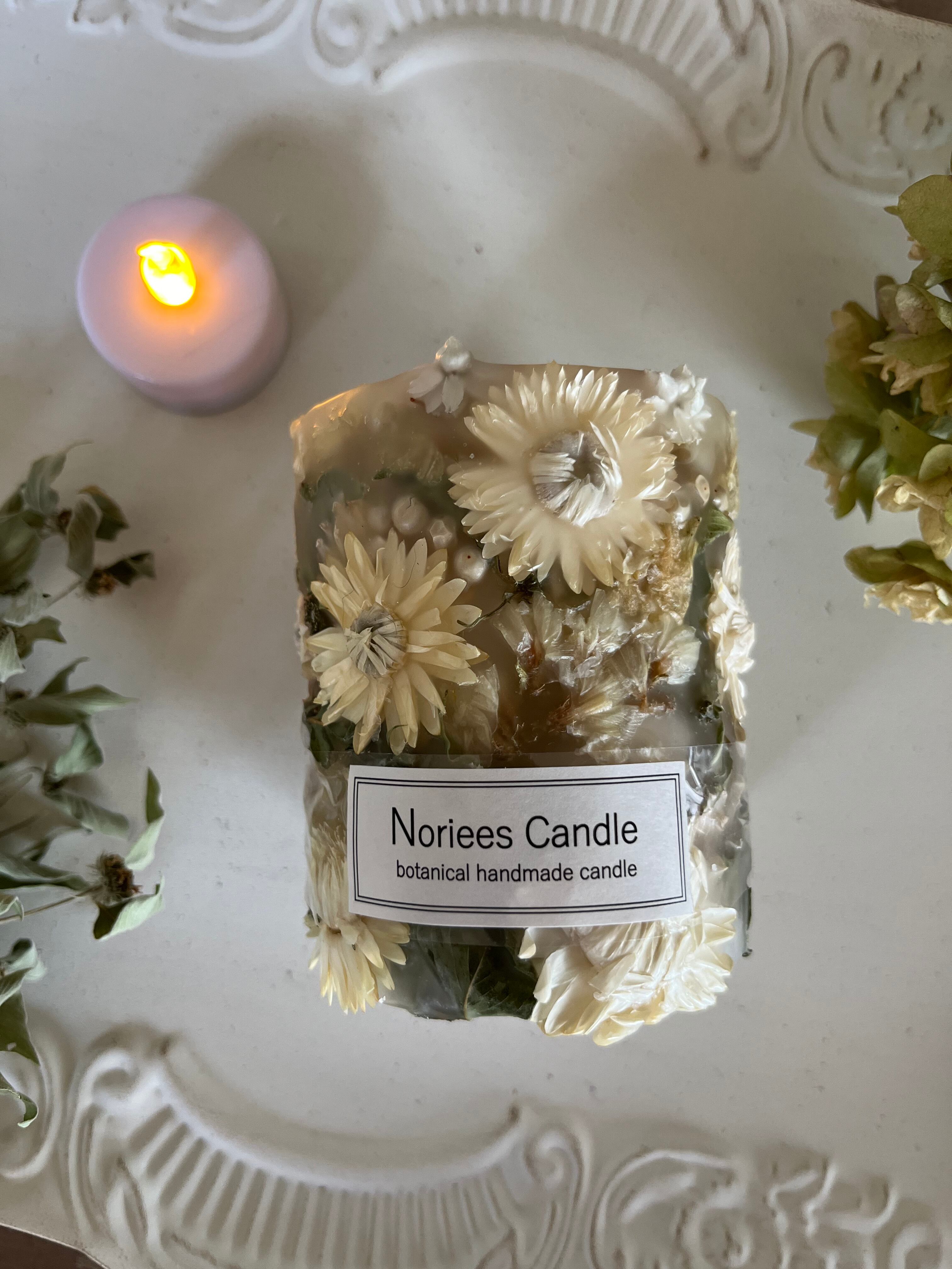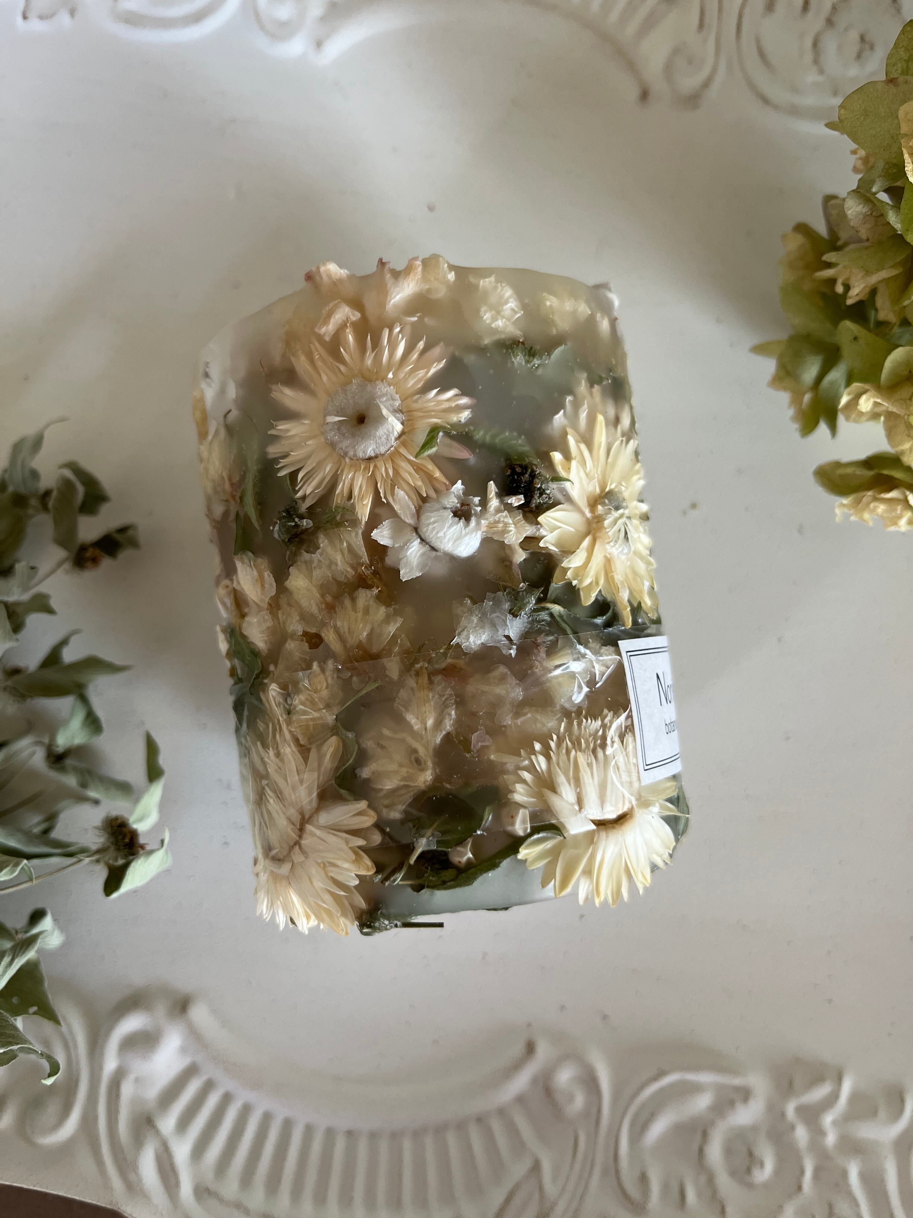 小さな花束のように天然ドライフラワーをふんだんに使用した1点1点手作りのボタニカルキャンドルです。揺らぐ灯りはキャンドルそのものの美しさです。
